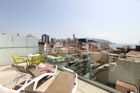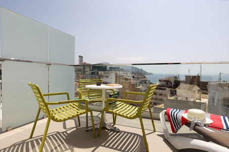 Disfruta de una experiencia única alojándote en nuestra Habitación Superior con Vistas al Mar, una de las joyas del Hotel Alameda Benidorm. Ubicada en la planta superior del hotel, esta estancia te ofrece una terraza privada equipada con hamacas, desde donde podrás contemplar el mar Mediterráneo y el animado entorno peatonal de la calle Alameda.