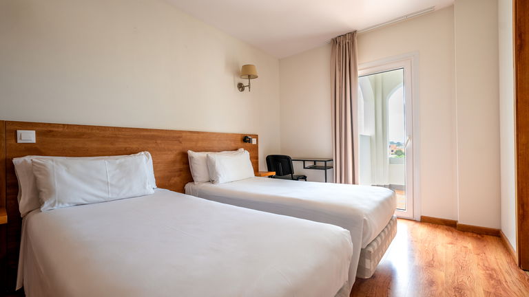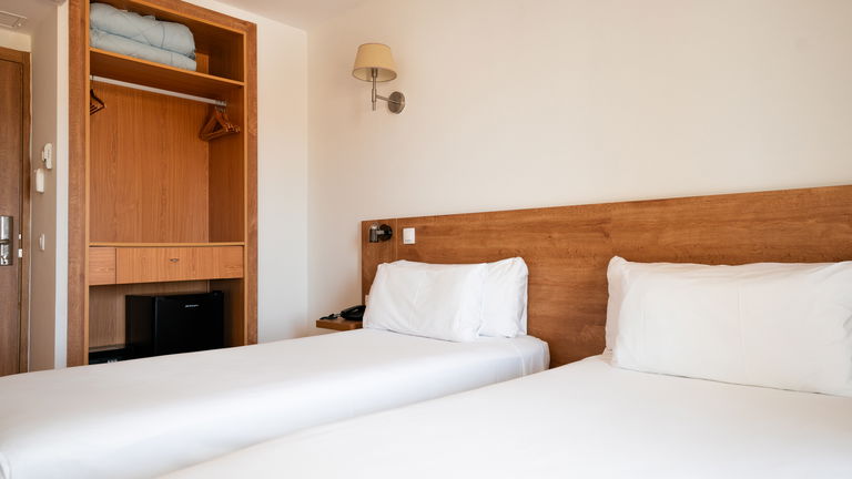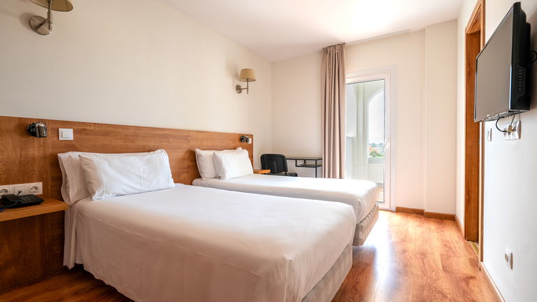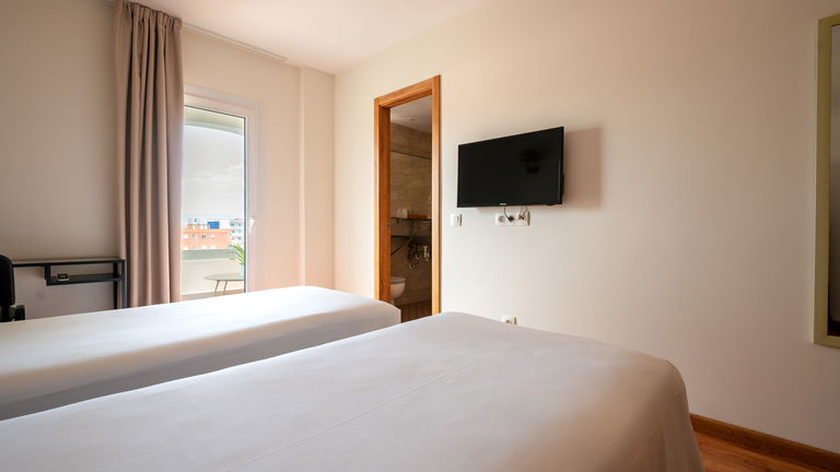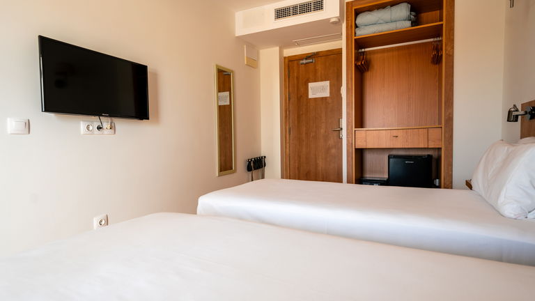 Podrás elegir entre una cama de matrimonio de 140 cm o dos camas individuales de 90 cm, según disponibilidad. Su decoración en tonos suaves y mediterráneos invita al relax, mientras que el mobiliario funcional asegura una experiencia práctica y confortable.