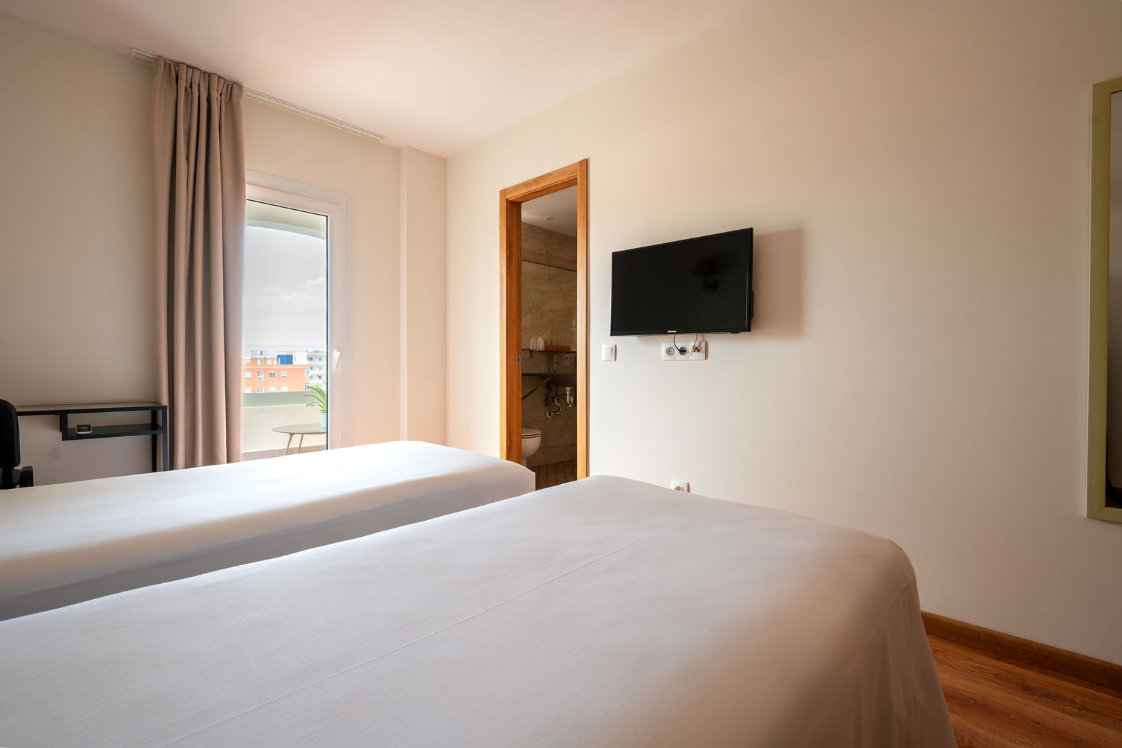 La Habitación Doble Sunny del Hotel Nura Santa Ponsa Pins ofrece 20 m² de amplitud y luminosidad. Diseñada para dos personas, esta categoría destaca por sus vistas a la piscina o a la calle, lo que aporta un toque extra de encanto a tu estancia en Mallorca.