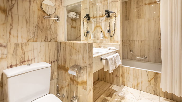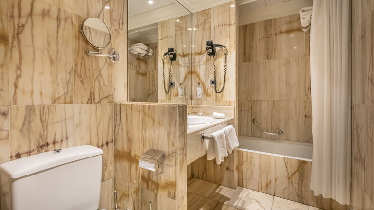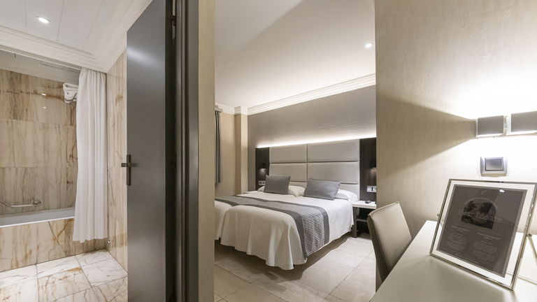 Está equipada con aire acondicionado, calefacción individual, escritorio, caja fuerte, hilo musical, televisión por satélite, radio, Wi-Fi gratuito, secador de pelo y un baño privado con set completo de amenities. La comodidad está en cada rincón, desde la calidad del colchón hasta la iluminación cuidadosamente dispuesta para cada momento del día.