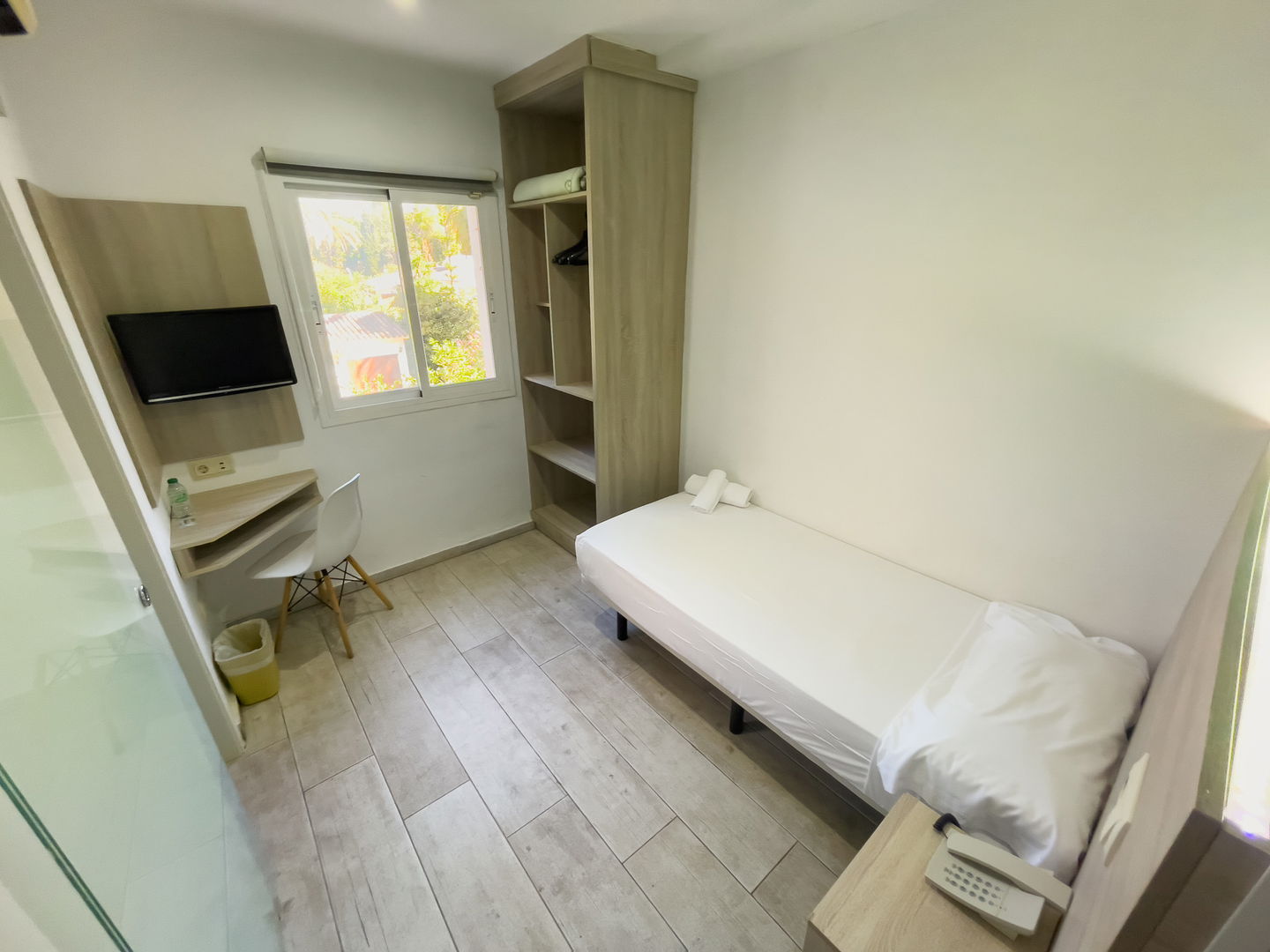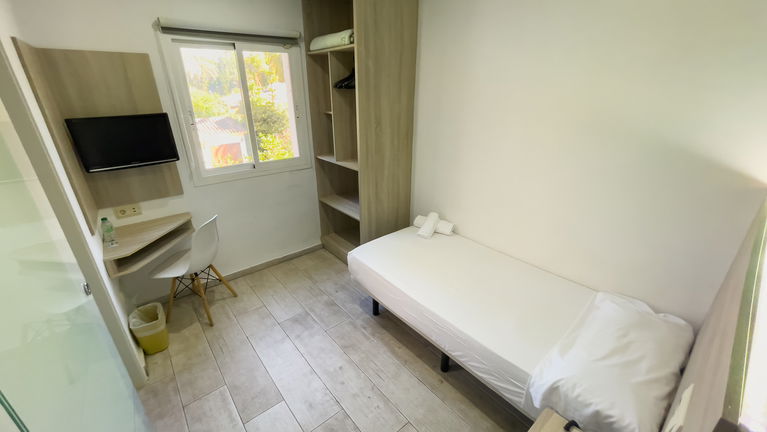 Dispone de una superficie de 10 m² optimizada al detalle para que no falte nada. Cuenta con una cama individual de 90 x 190 cm, aire acondicionado, conexión Wi-Fi gratuita, escritorio, televisión de pantalla plana y baño privado completo. Es una habitación luminosa, silenciosa y pensada para que disfrutes de privacidad y confort en un entorno relajado.