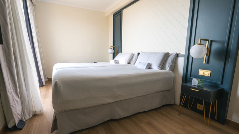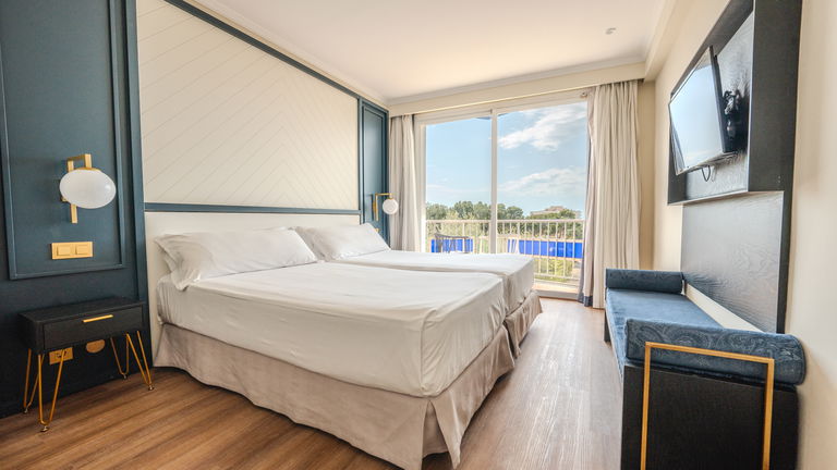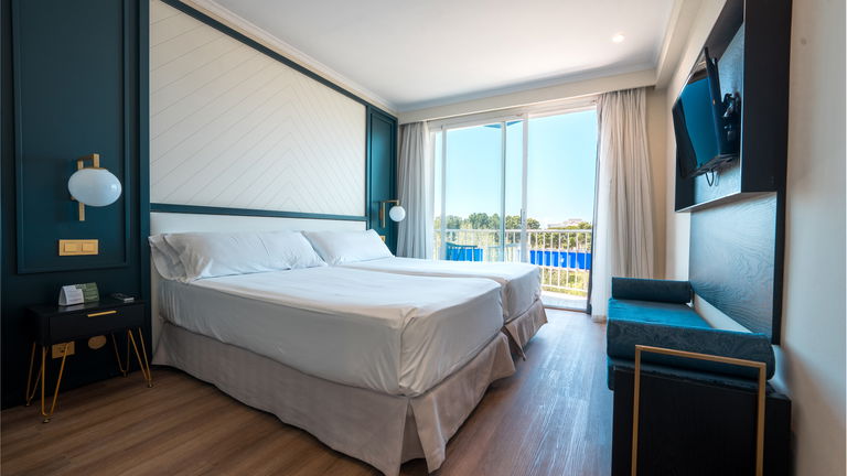 La decoración es sobria, luminosa y pensada para ofrecer un ambiente cálido y funcional, en línea con el estilo del hotel. Gracias a su tamaño y disposición, es perfecta tanto para familias con niños como para grupos de amigos que desean una estancia económica, cómoda y bien comunicada con el centro de Palma y el aeropuerto.