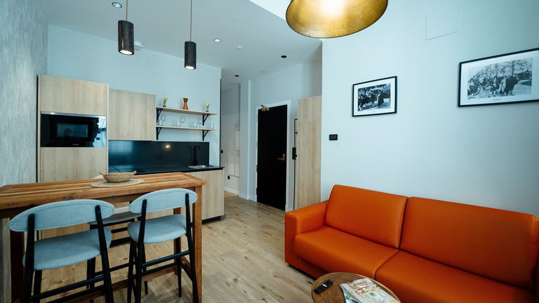 La Urban Suite del Hotel Luz de Gades ofrece un equilibrio perfecto entre diseño contemporáneo, amplitud y confort. Con 40 m², es una estancia luminosa que combina salón y cocina en un mismo espacio, ideal para quienes desean sentir la libertad de alojarse en un entorno versátil y sofisticado.