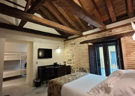 Esta habitación está equipada con una cama de matrimonio y una litera, lo que permite alojar hasta cuatro personas sin sacrificar comodidad. El mobiliario de madera, los muros con piedra vista y los suelos rústicos respetan la estética histórica del edificio, al mismo tiempo que crean un entorno cálido y familiar.