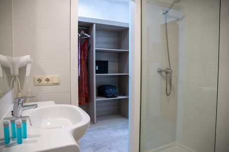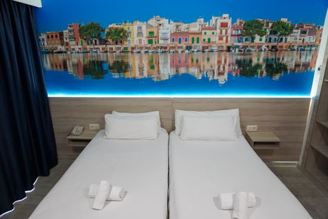 Está equipada con dos camas individuales de 90 x 190 cm, aire acondicionado, Wi-Fi gratuito, televisión, armario y baño privado con todo lo necesario para tu día a día. La decoración es sencilla pero cuidada, con colores neutros y luz natural que invita al relax tras un día explorando Mallorca.